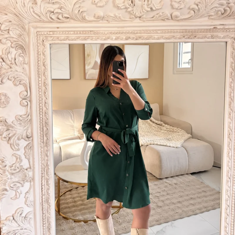 Cette robe chemise verte séduit par sa coupe féminine et son style chic facile à porter.