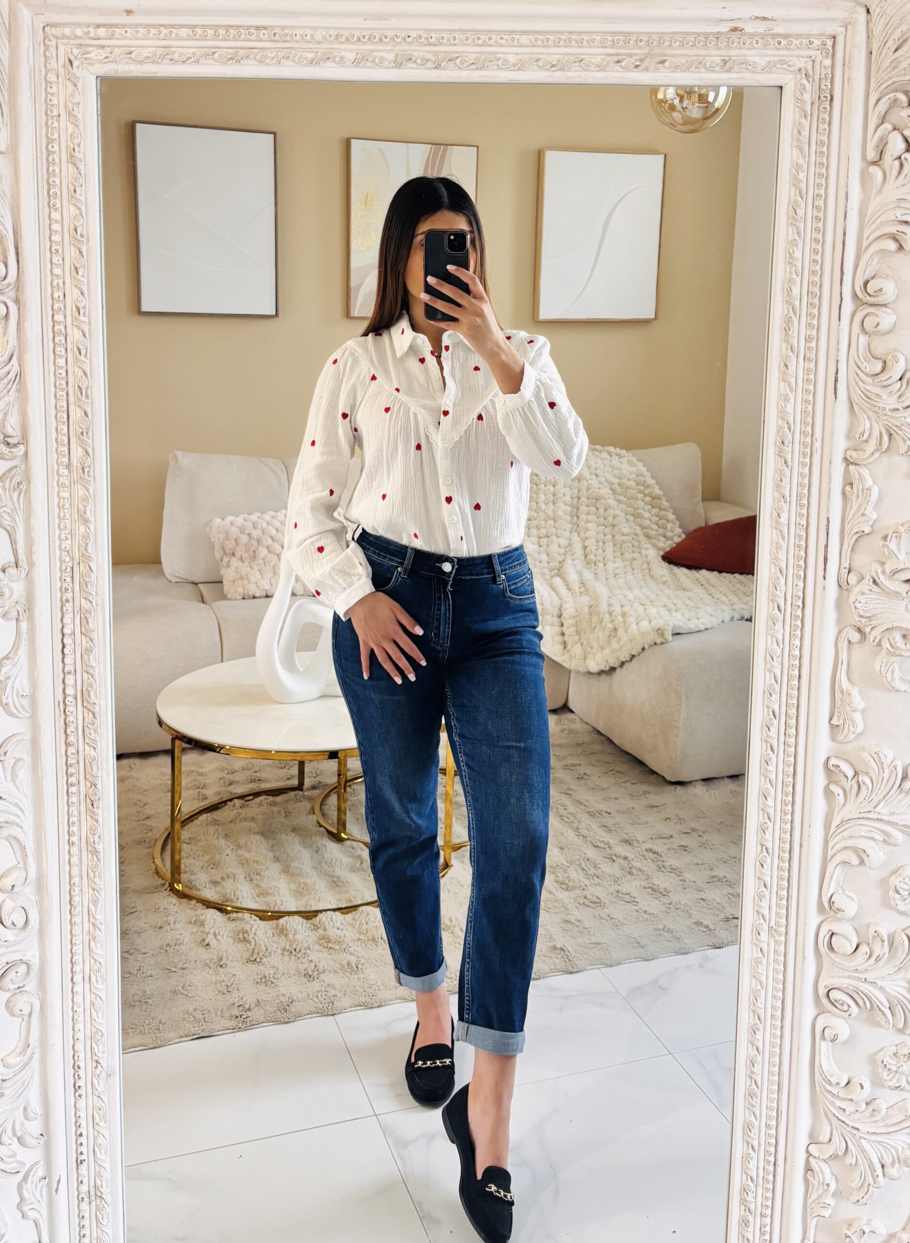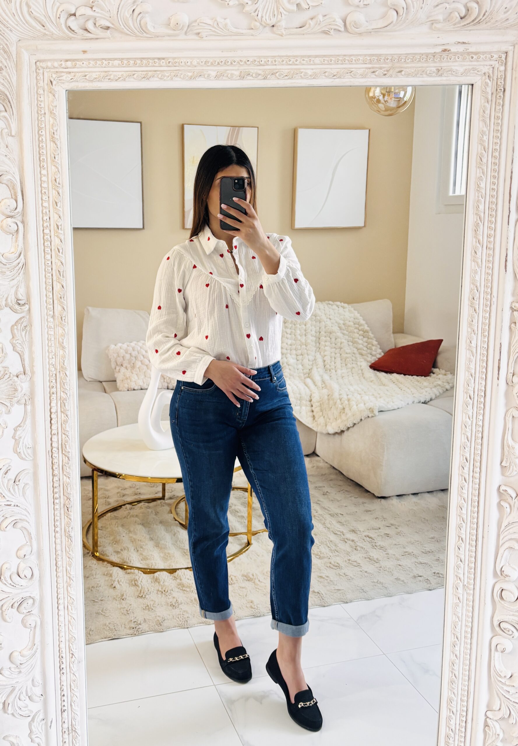 Chemise blanche à coeurs rouges