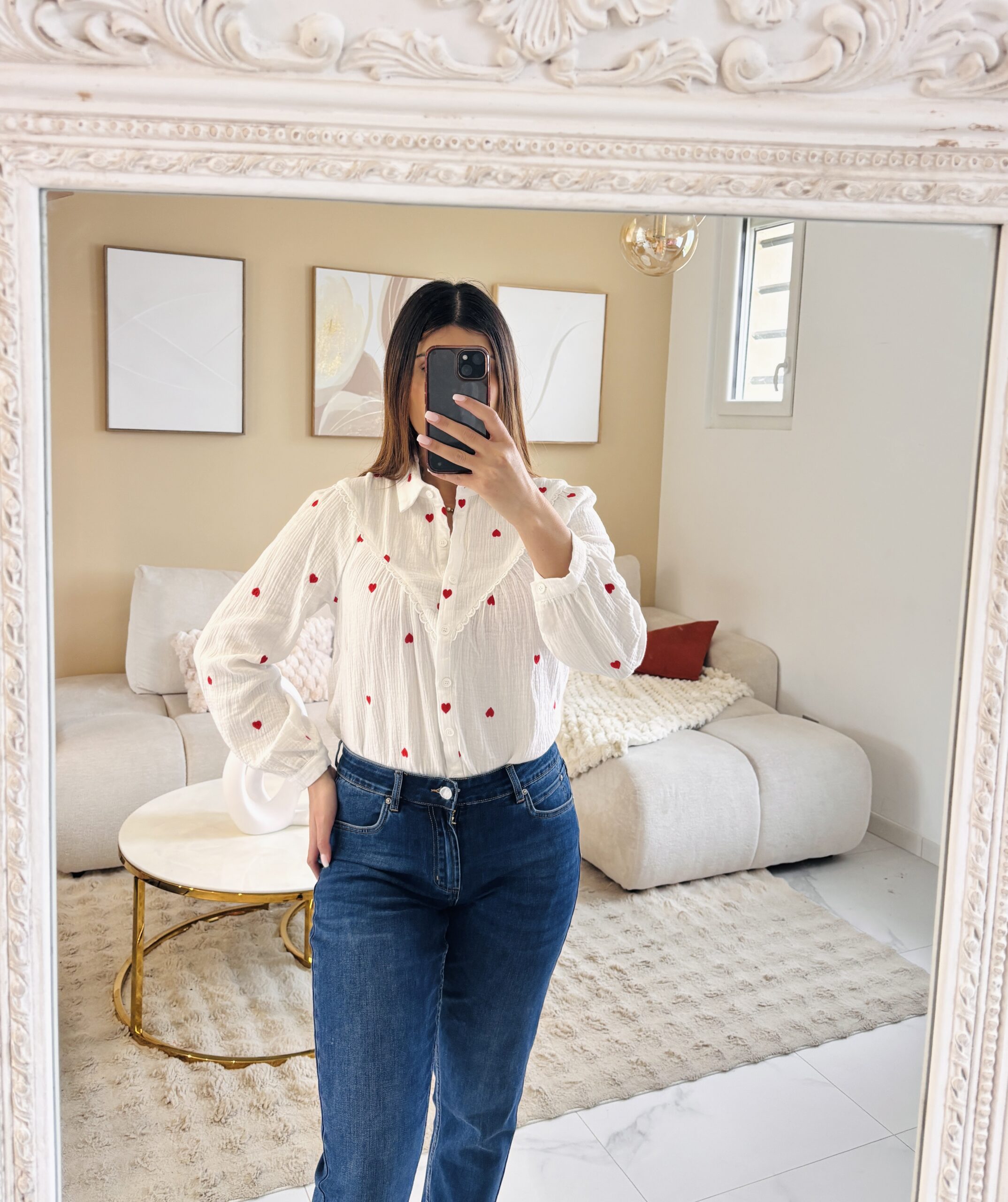 Chemise blanche manches longues motif coeurs rouges