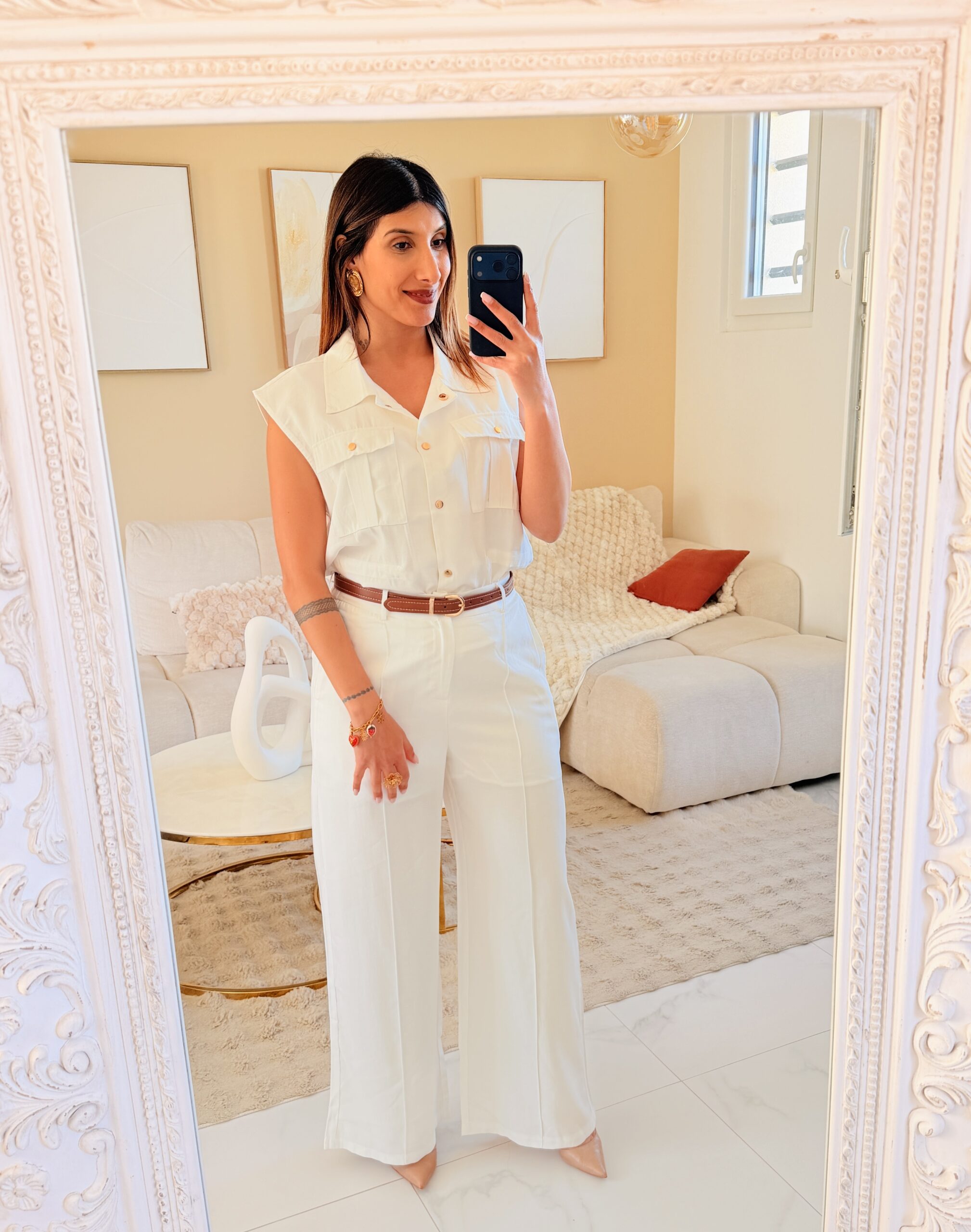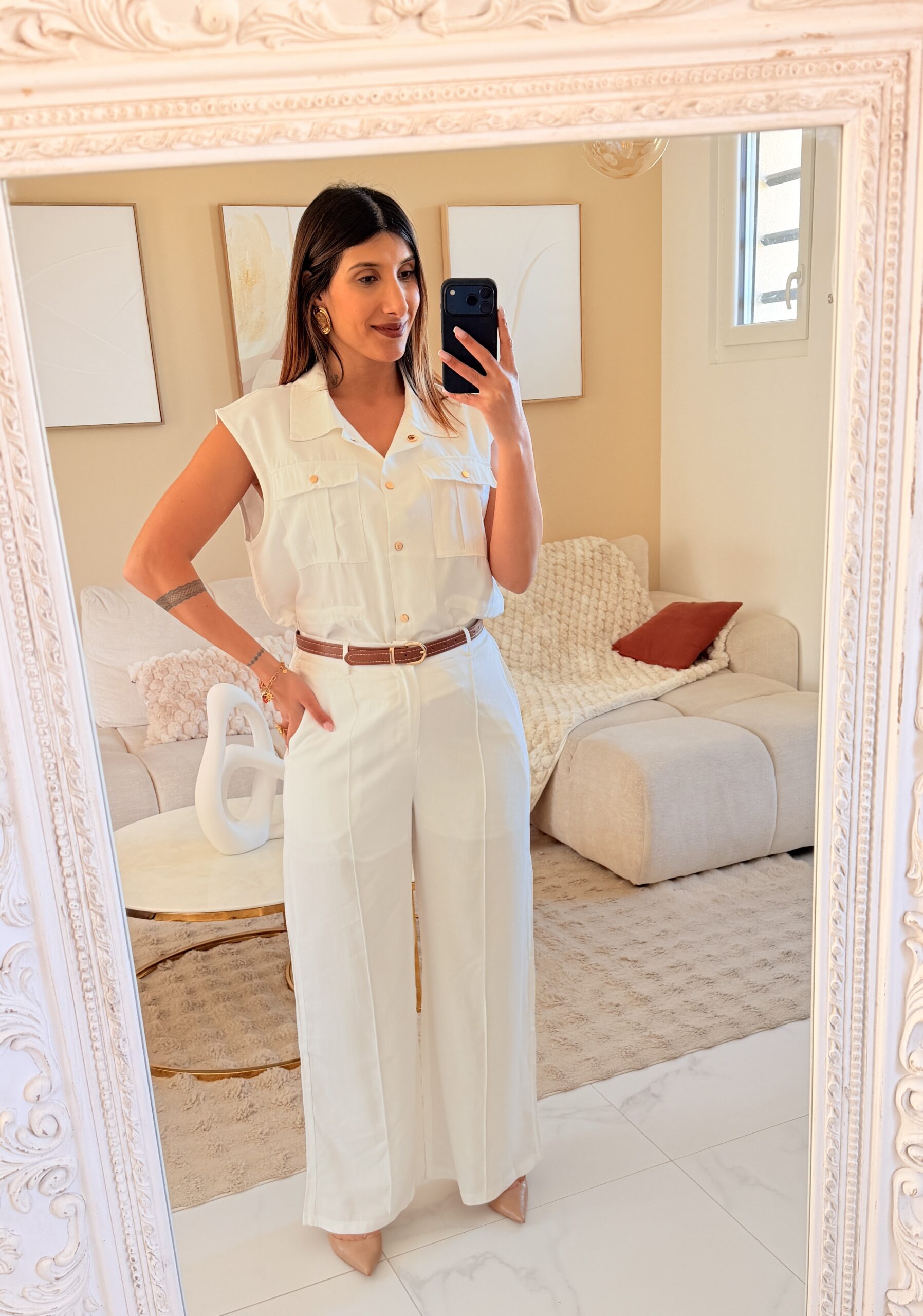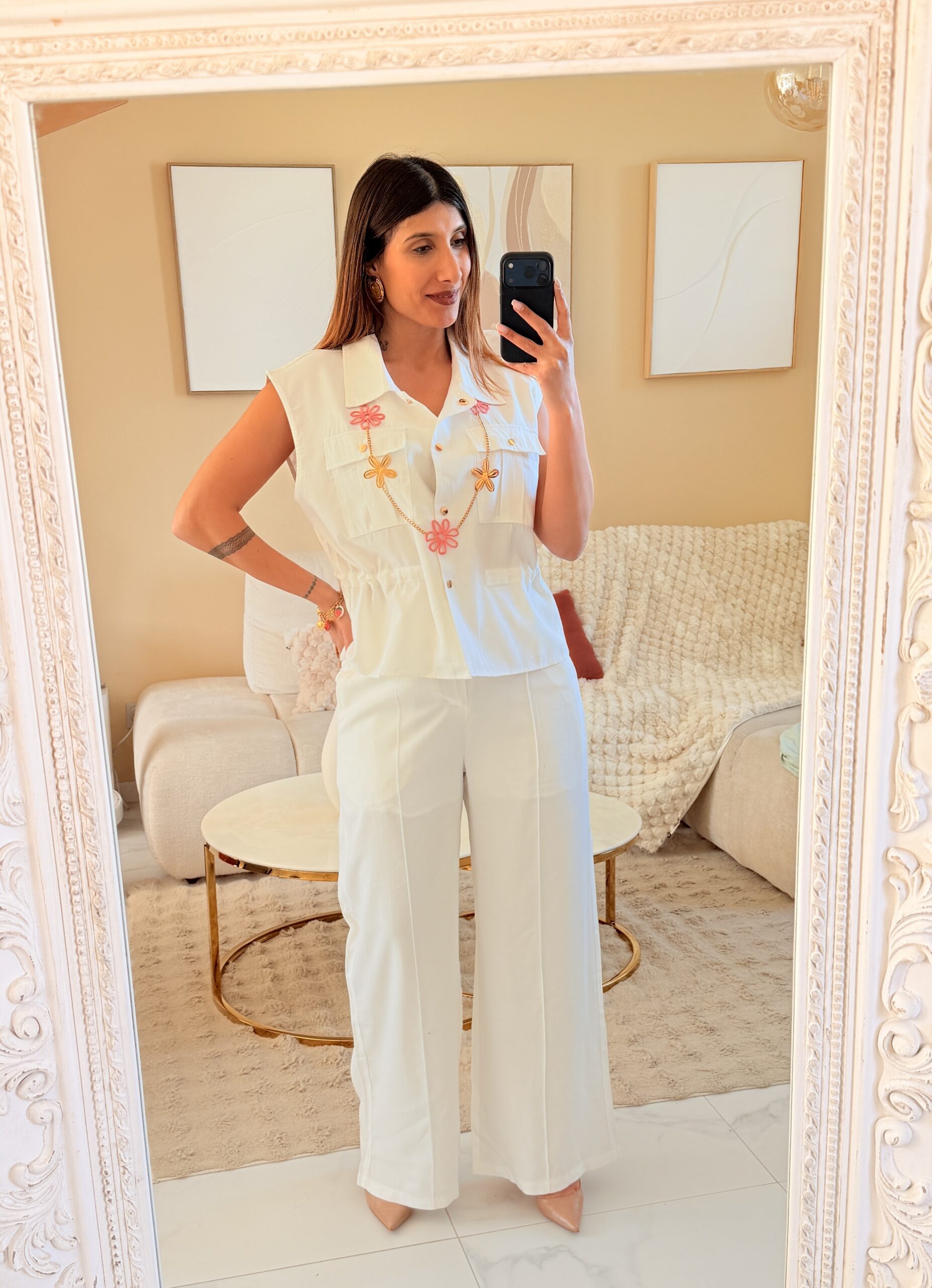 Ensemble blanc femme chic – pantalon large et haut structuré