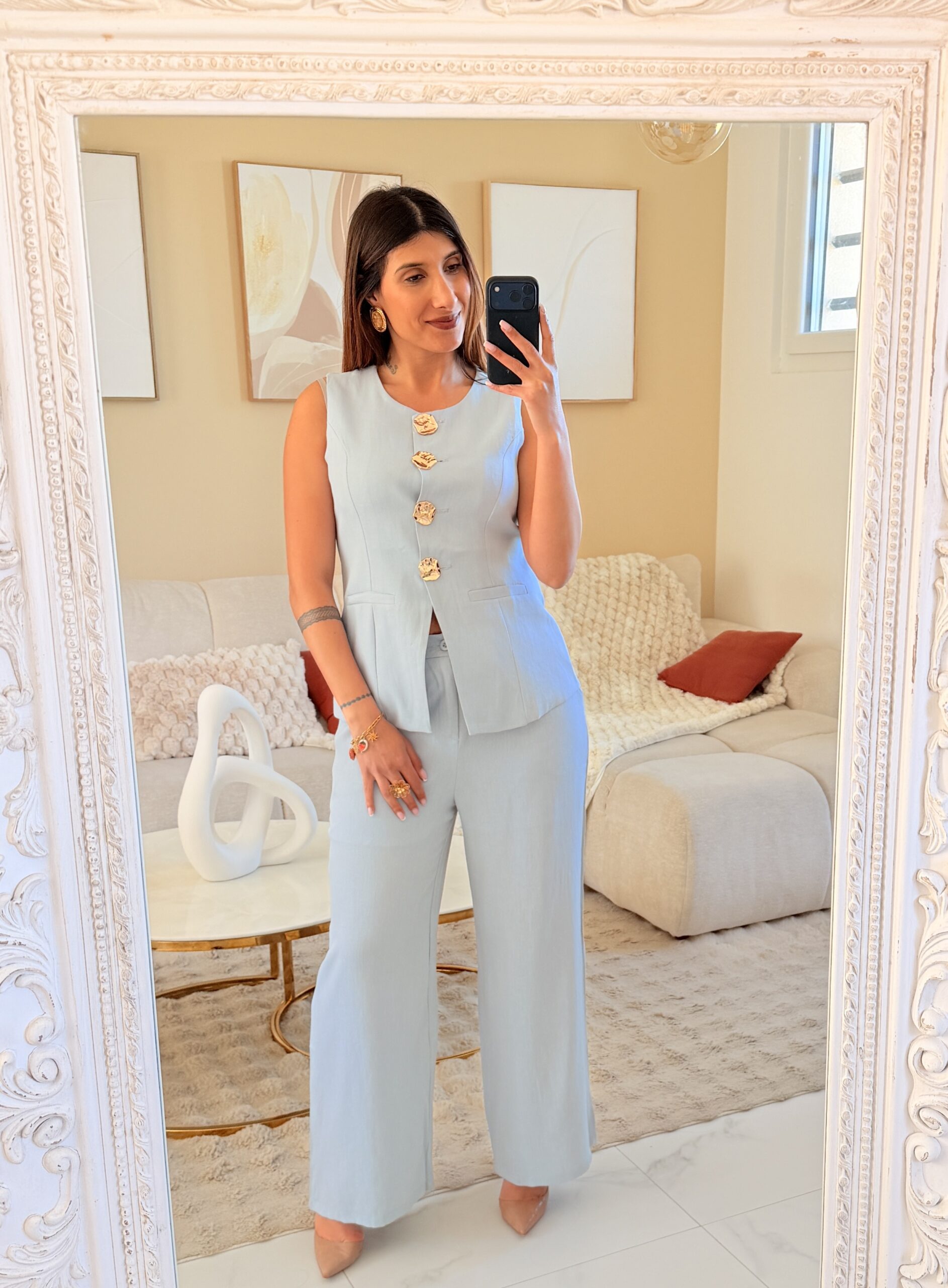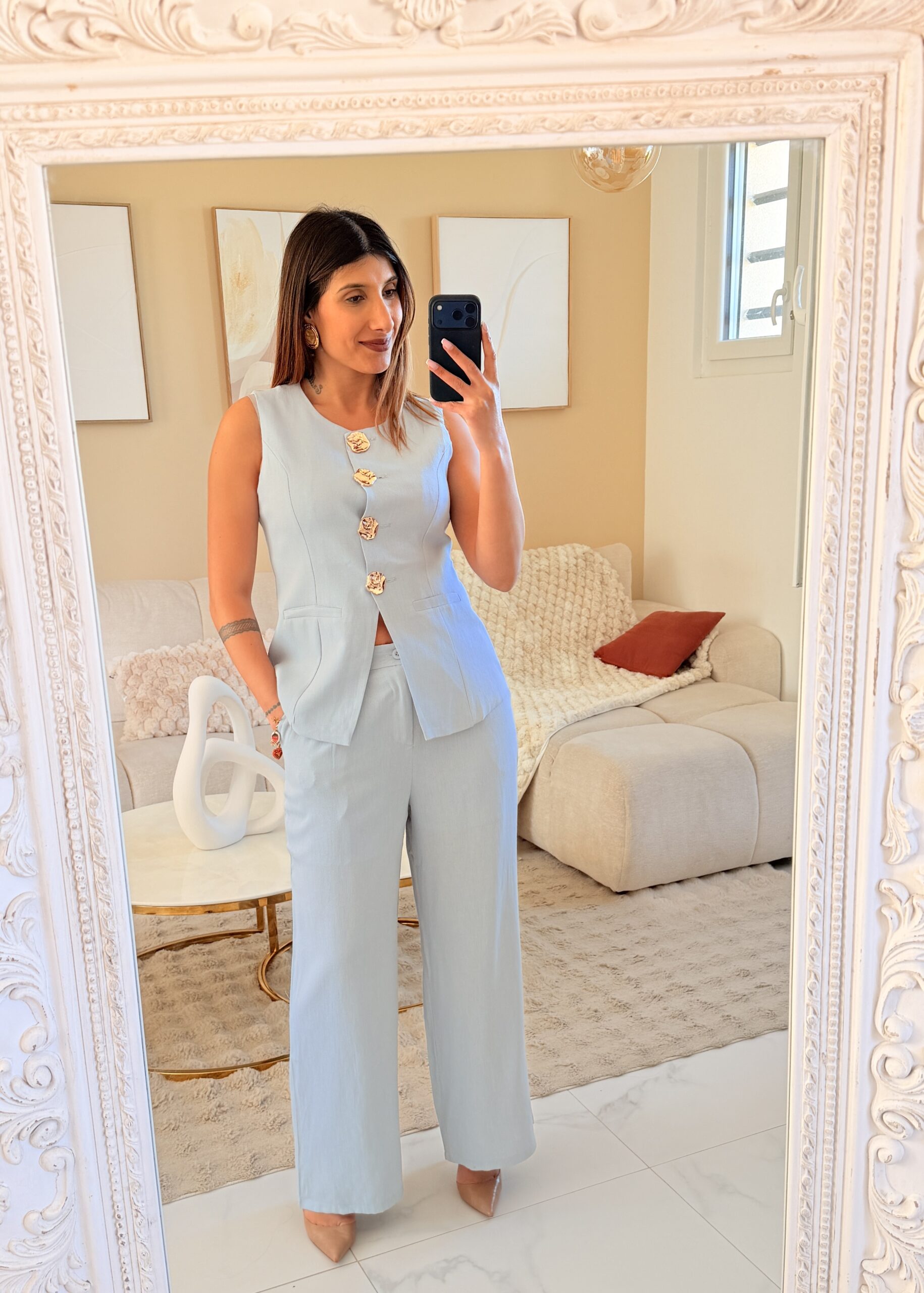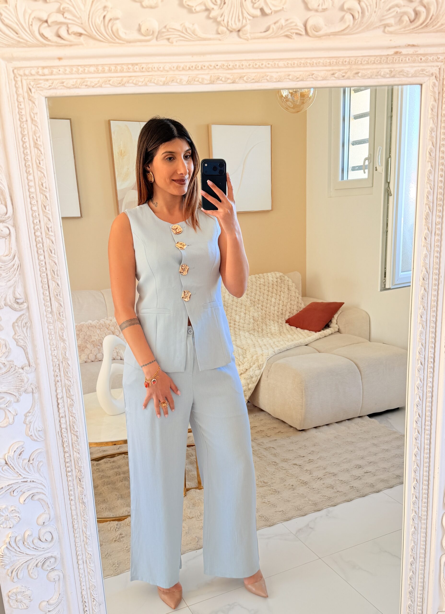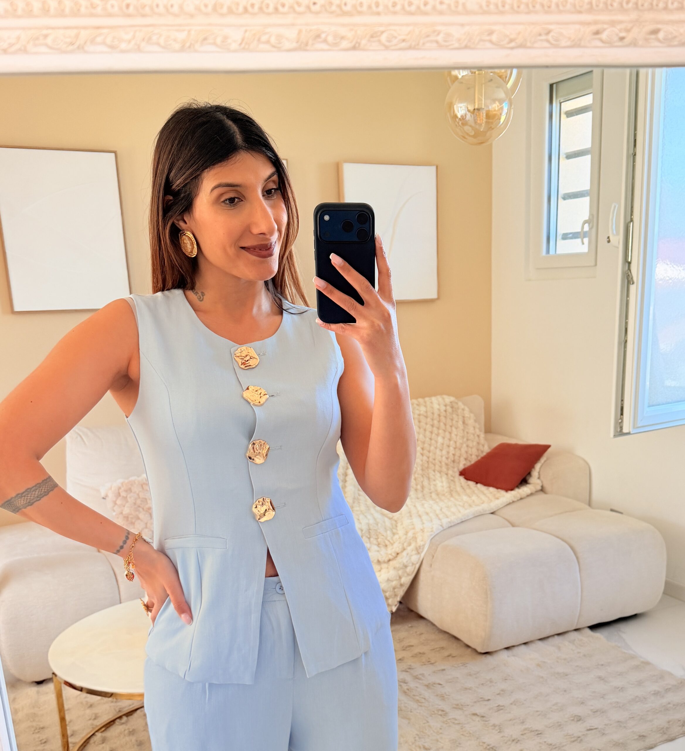 Sa teinte bleu pastel apporte une touche lumineuse et raffinée, sublimée par des boutons dorés au détail travaillé.