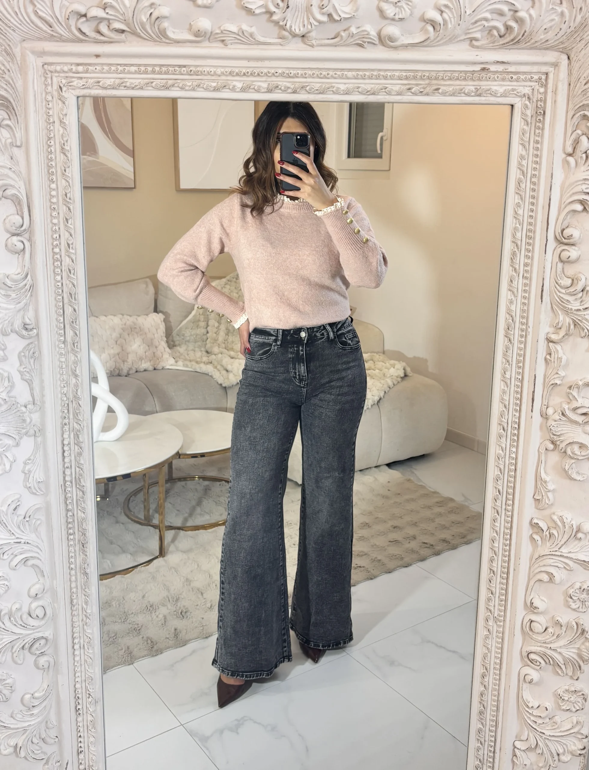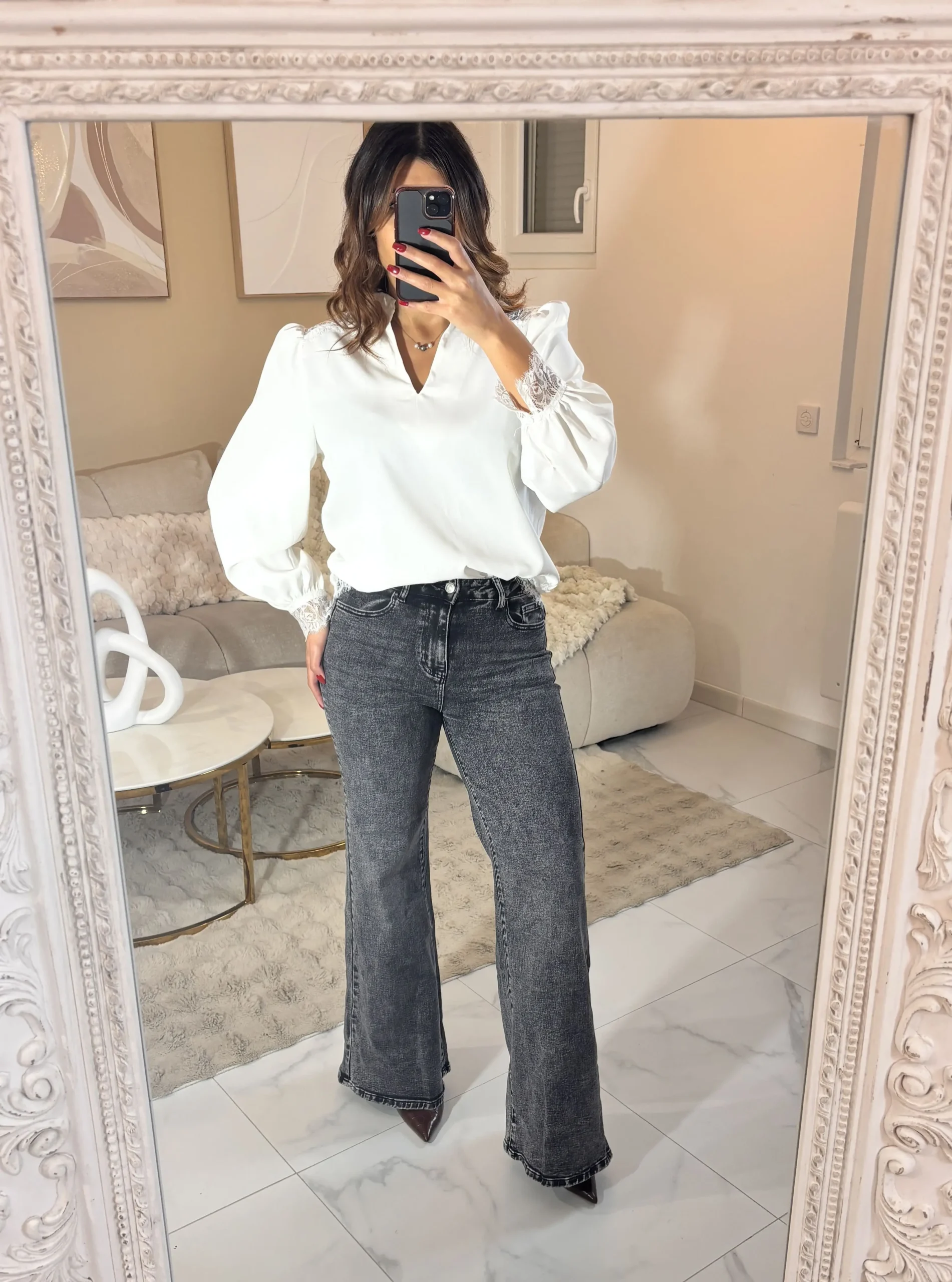 Jean brut noir, coupe confortable et facile à porter au quotidien.