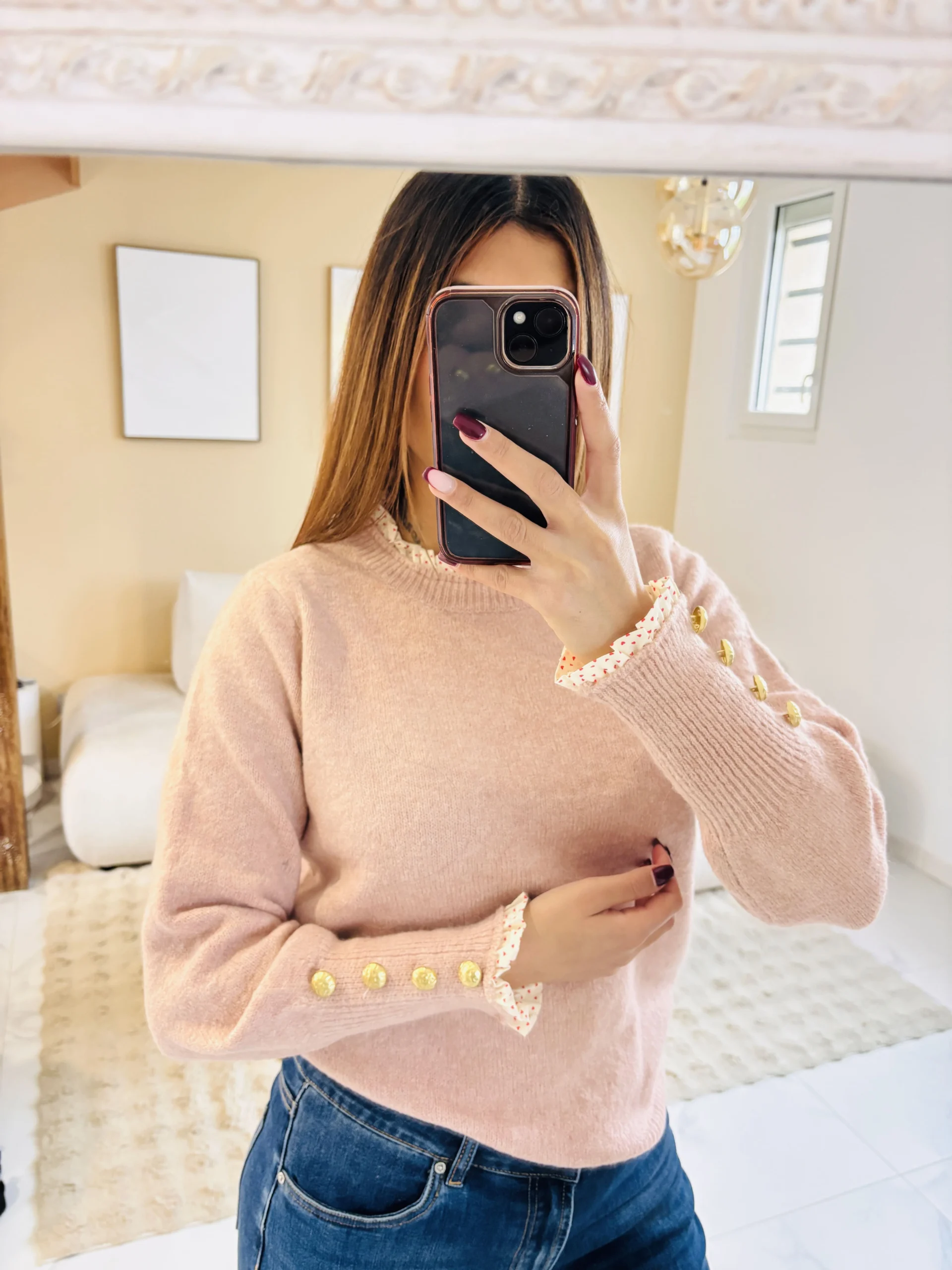 Pull rose doux aux détails cœur, facile à porter au quotidien.