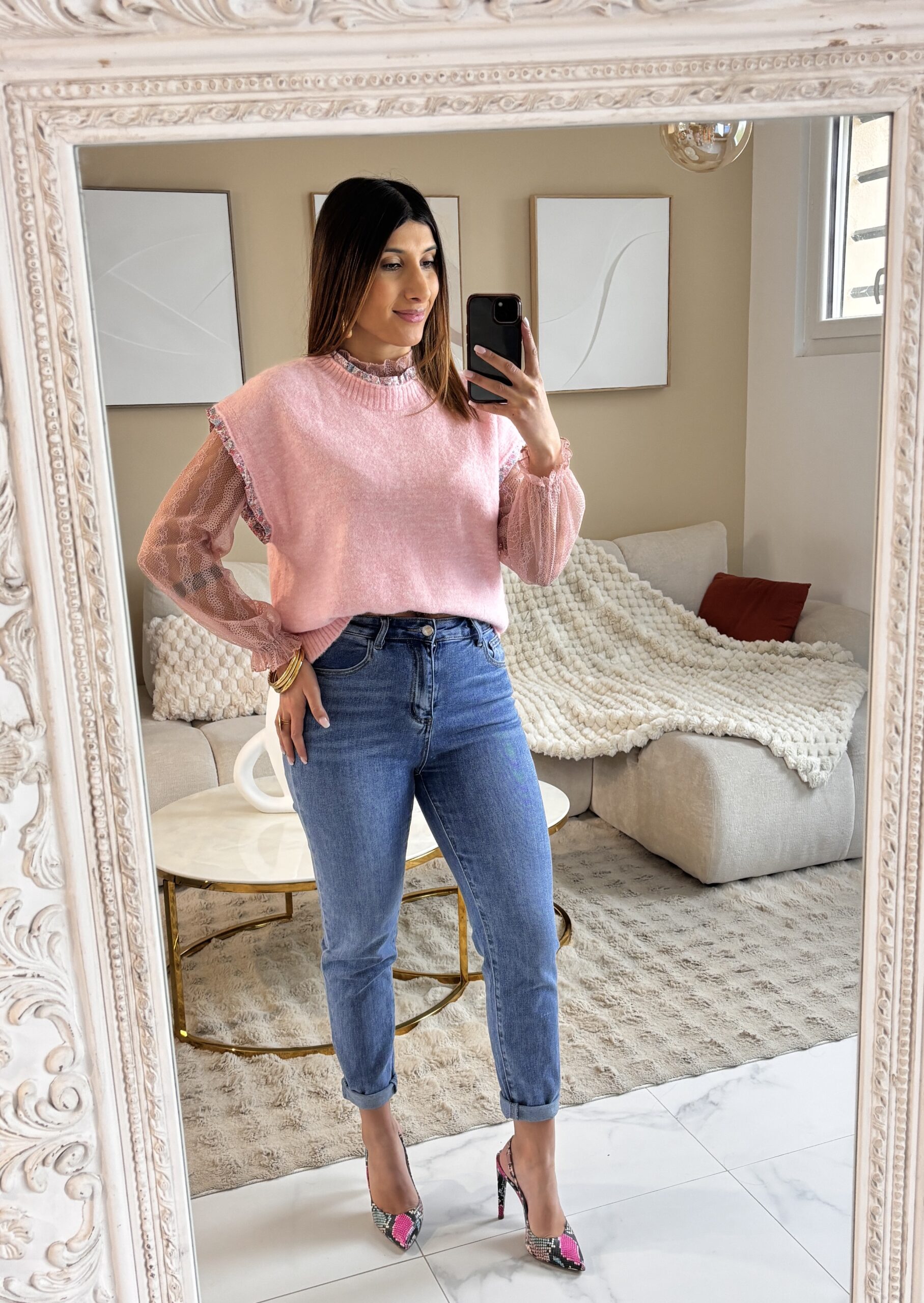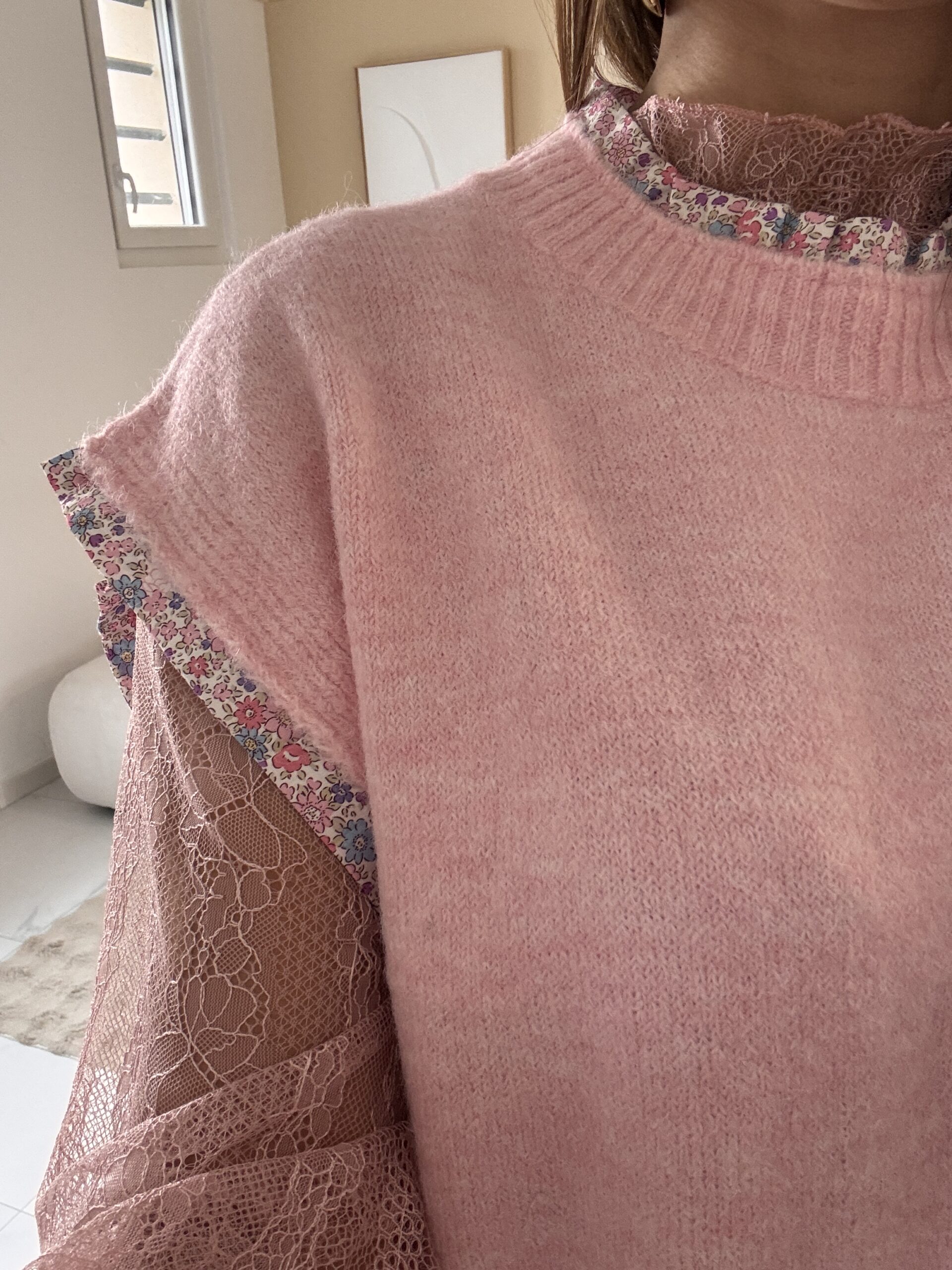 Joli pull sans manche rose tout doux et agréable à porter! Détails fleurs sur les manches et le col.