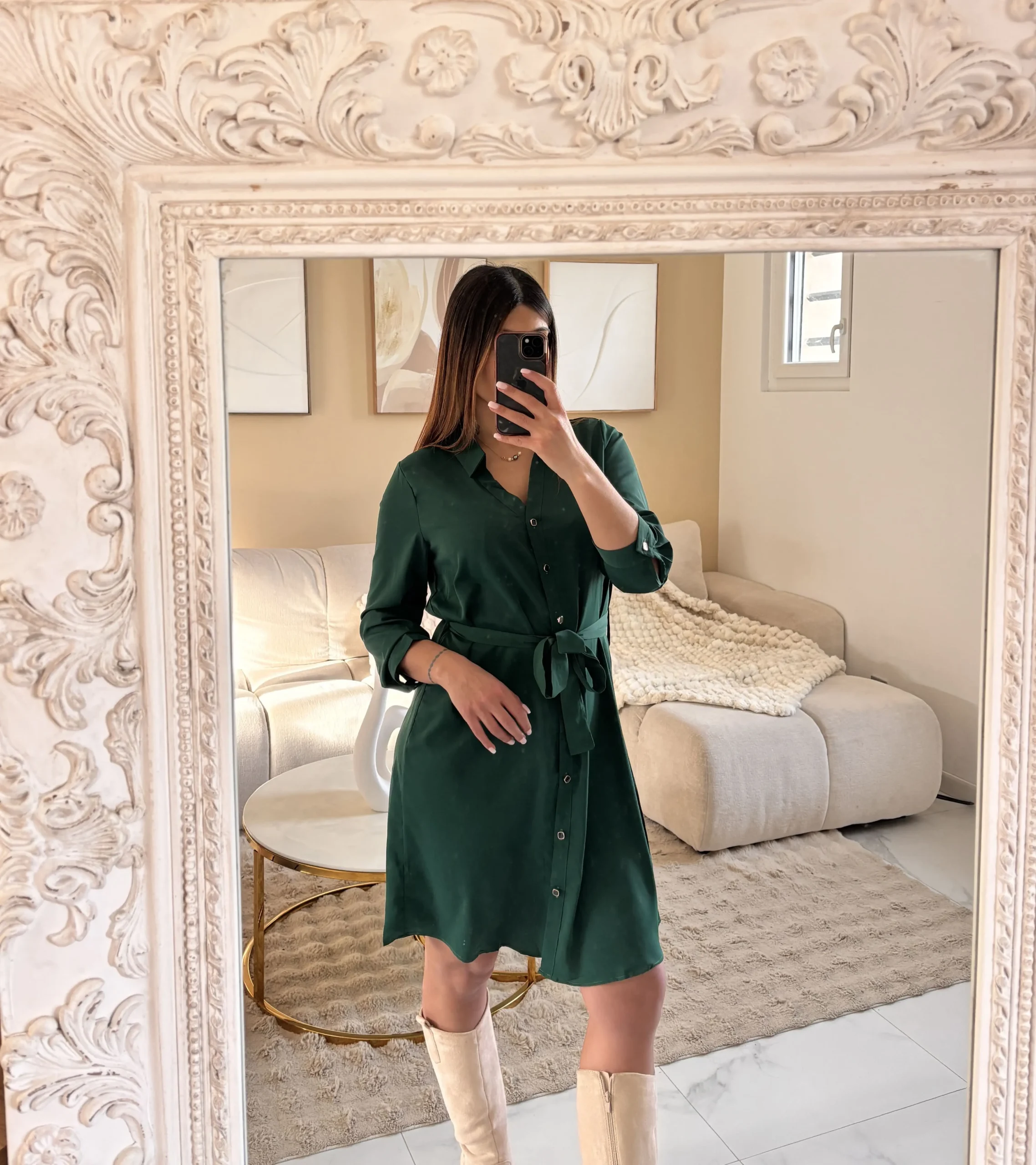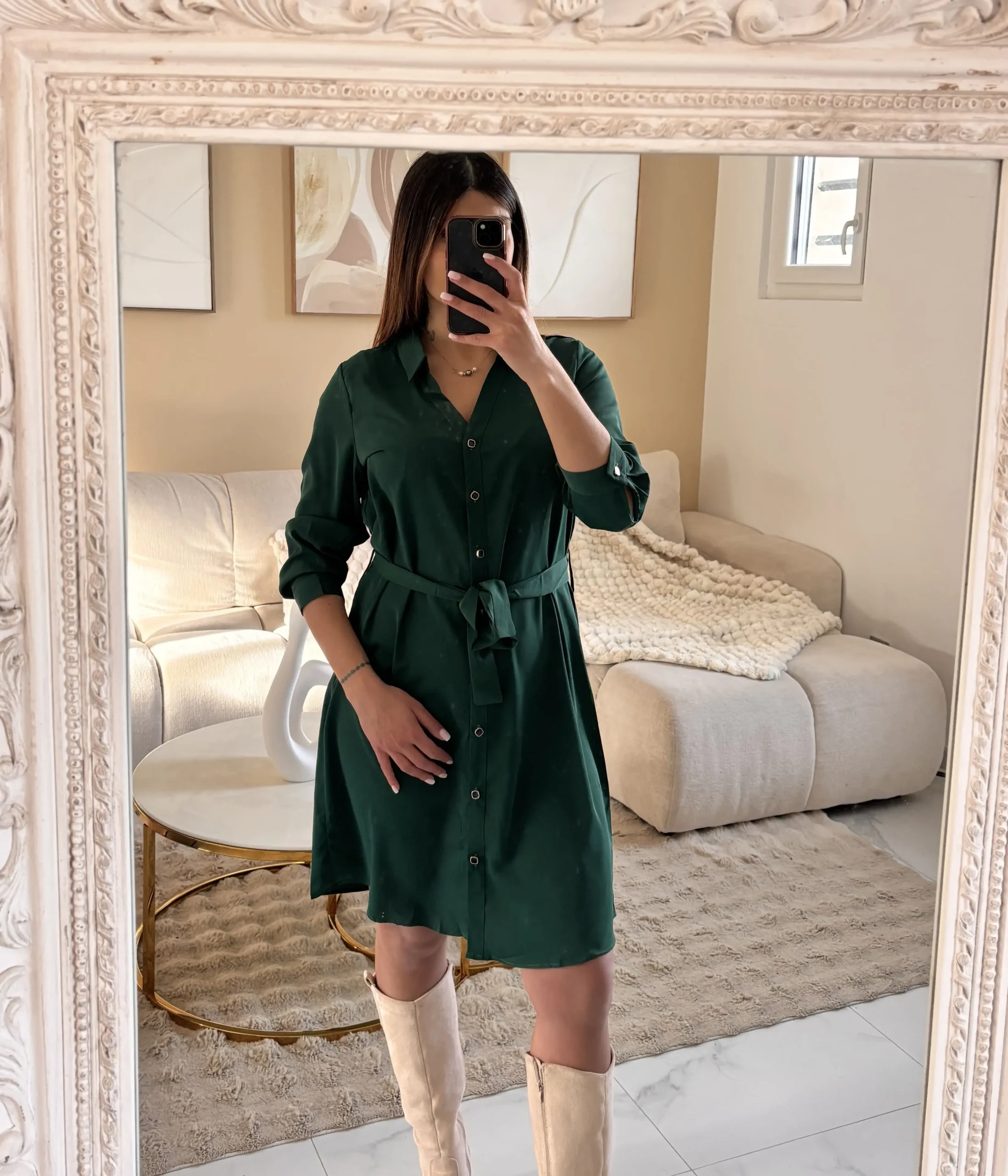 Cette robe chemise verte séduit par sa coupe féminine et son style chic facile à porter.