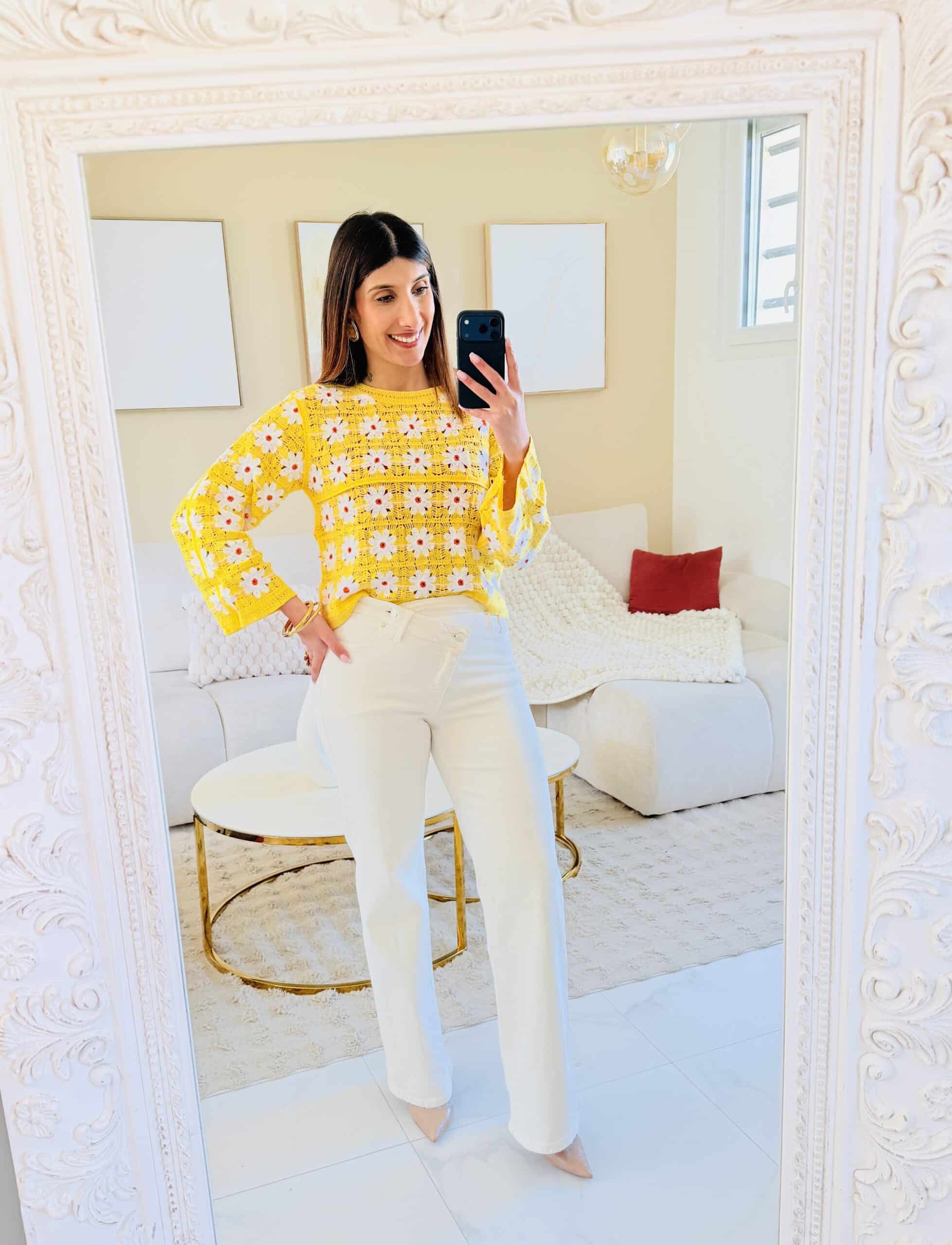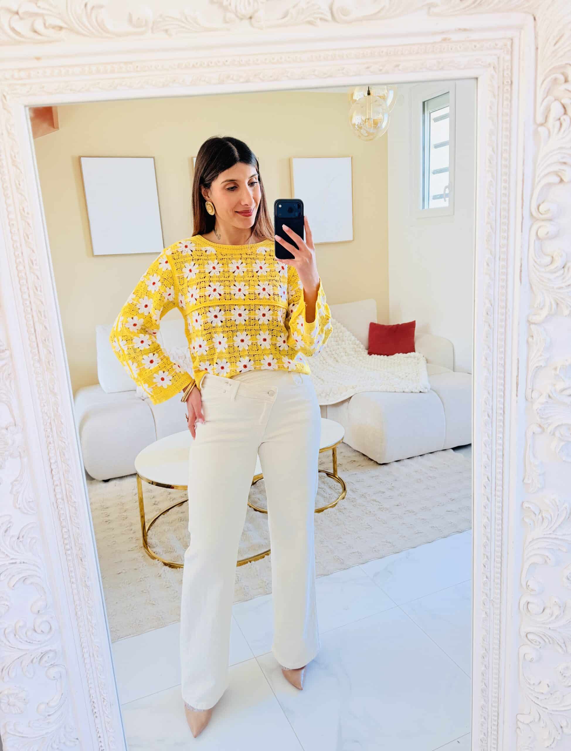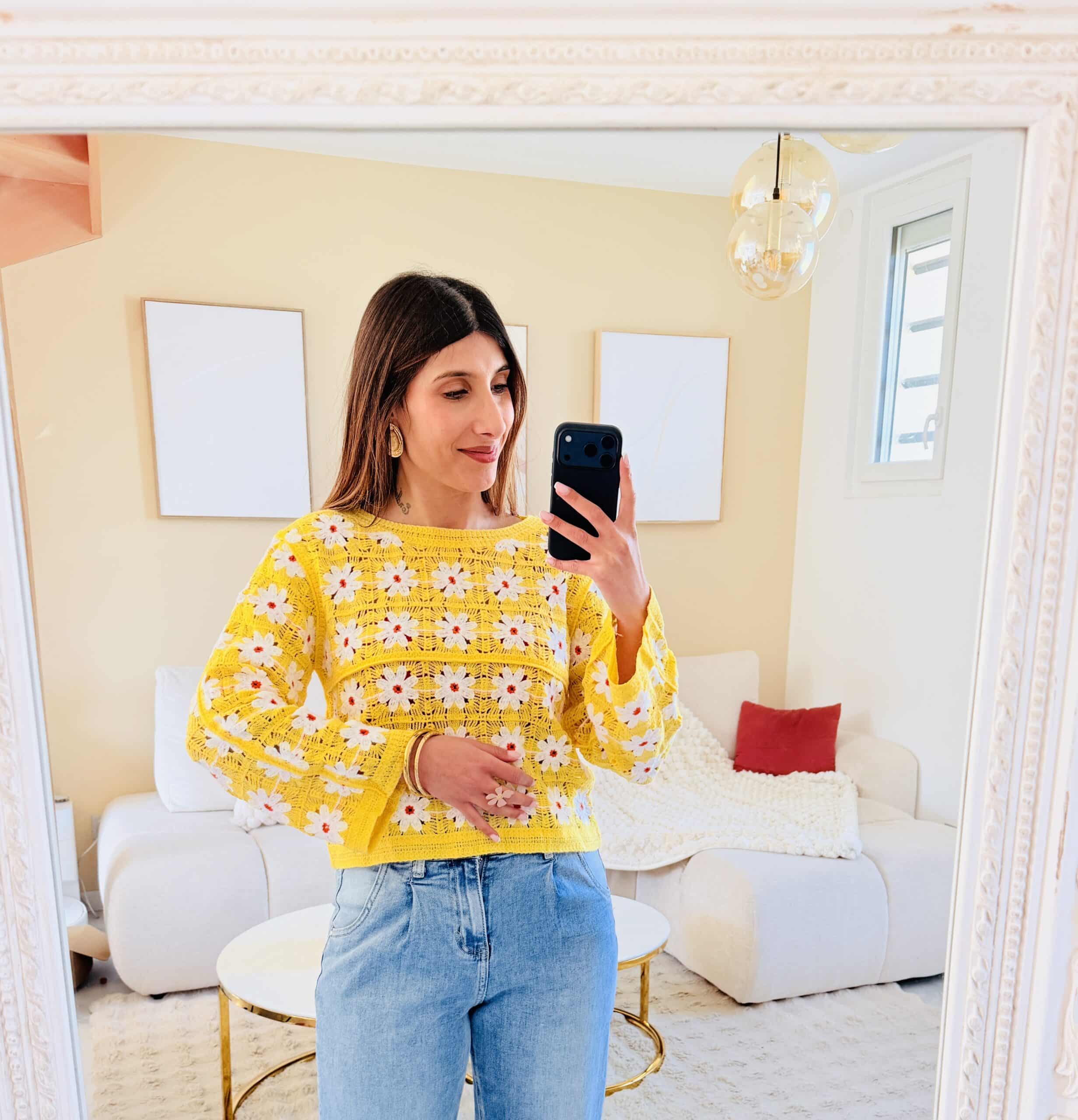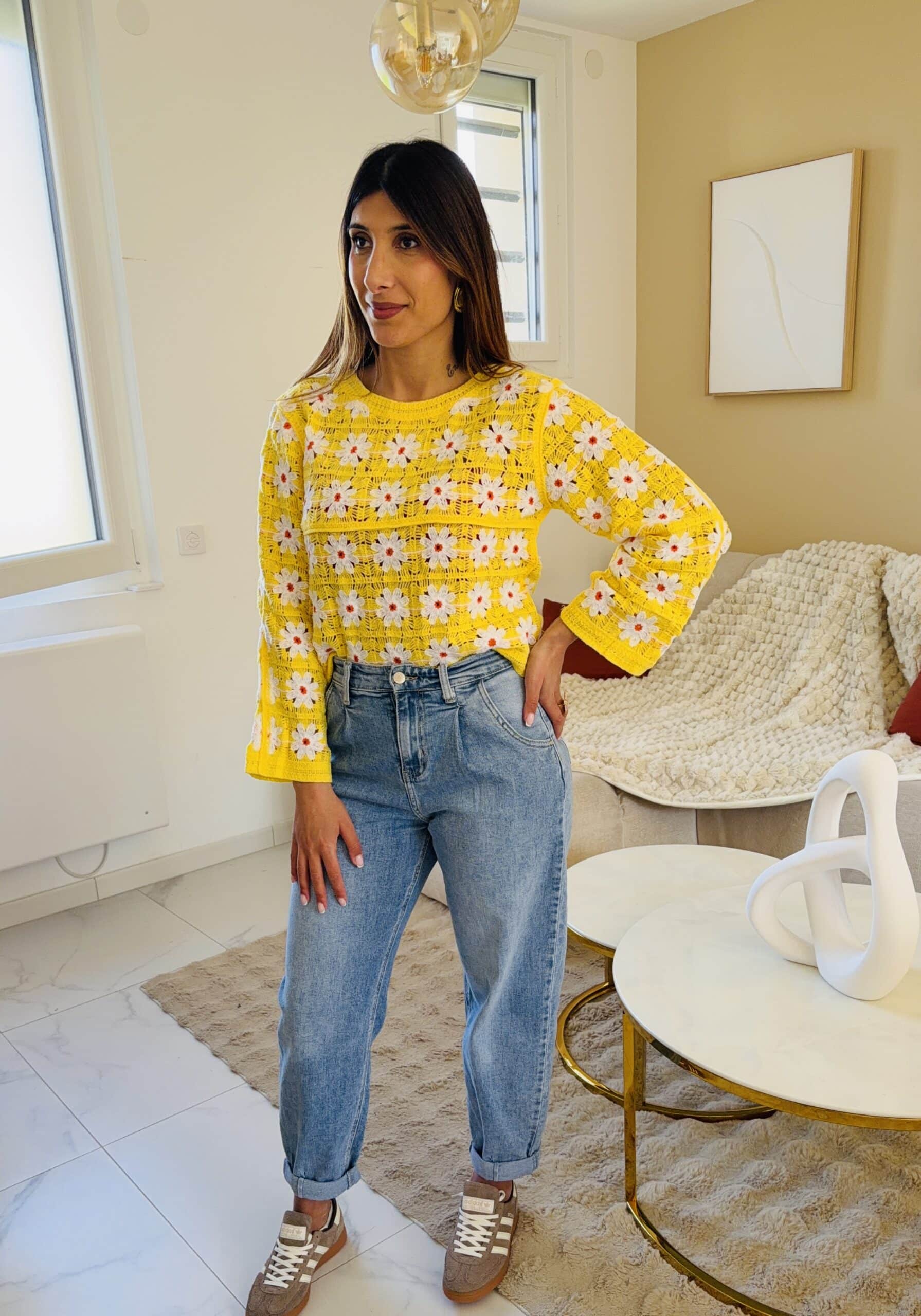 Sublime top en maille jaune avec motifs fleurs blanches, à associer avec un jean !